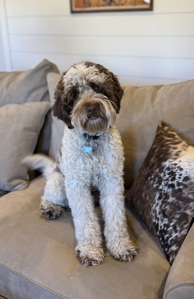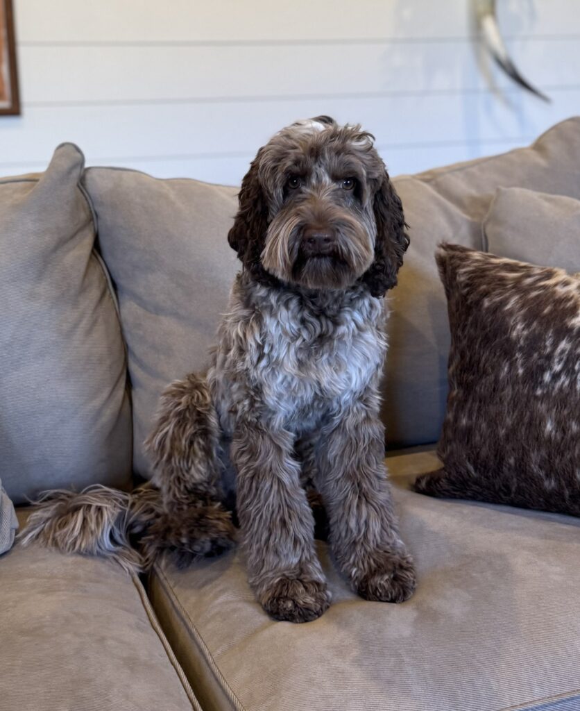Echo’s adventurous demeanor is fun and pure joy to be around. He has a brilliant mind and a playful spirit known for carrying a ball or stuffed animal everywhere he goes. He is my loyal companion, always by my side helping with barn chores, on the back of my four-wheeler, or soaking up the sunshine out on the golf course. Echo has completed advanced off leash e-collar training with K9 Ridgeside COS and it shows in the way he carries himself; quiet, confident, and attentive. He has sired many pups sharing his incredible demeanor and several have gone into service dog lines.